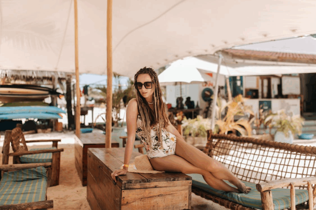 Use the water to your advantage! Bring along a brush and some gel and you’ll have a cute slicked back bun in no time. As for the outfit? Wear a simple linen or cotton flowy dress that allows you to feel free and comfortable. A big floppy hat can pull together the whole look.